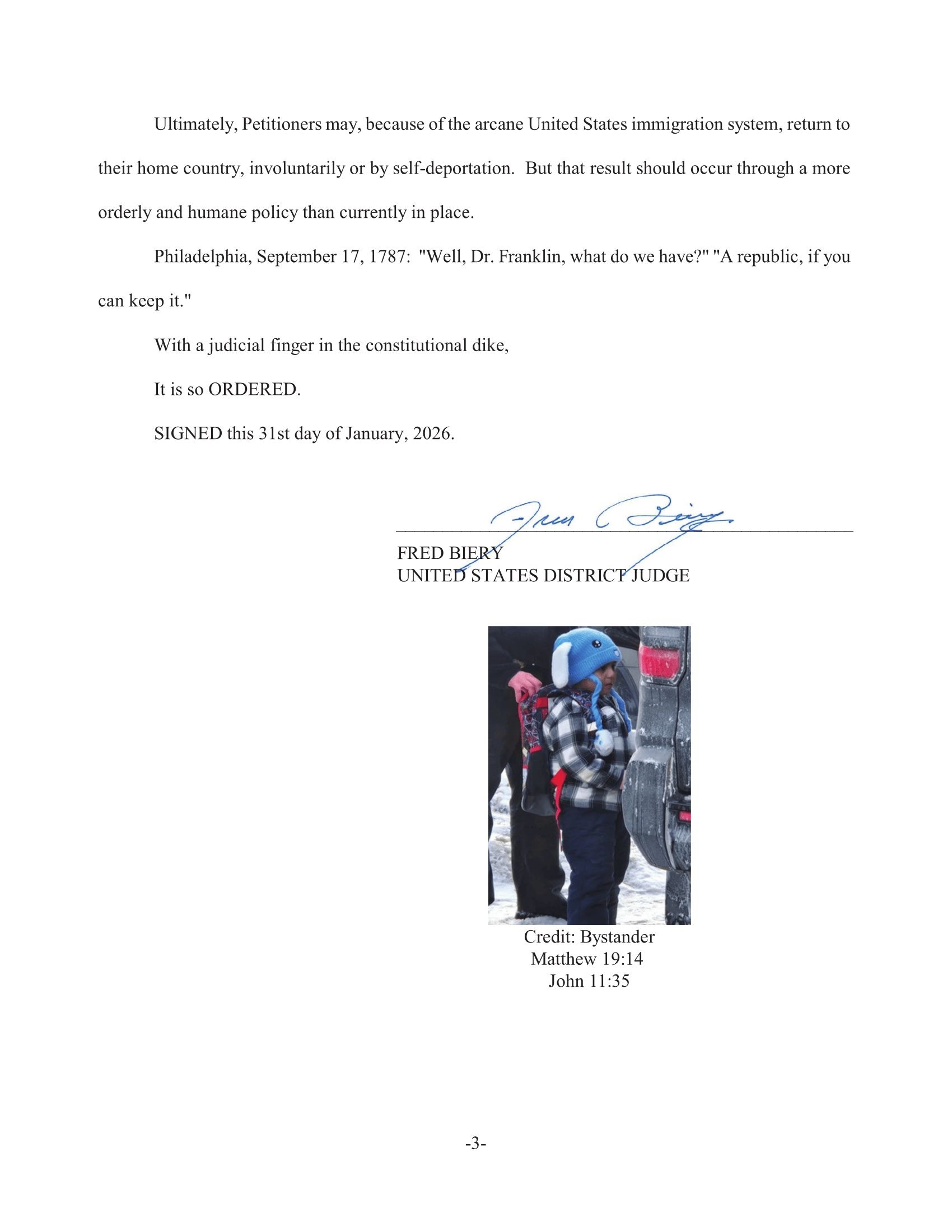 Tribinal yo pa t rete an silans. Nan Texas, Jij Fred Biery te bay yon desizyon ki bay lòd pou lage Liam Conejo Ramos, ki gen senk an, ak papa l nan detansyon ICE. Desizyon an se yon kou mèt nan elokans jidisyè, epi li merite li an antye. Men sèten pasaj mande atansyon.